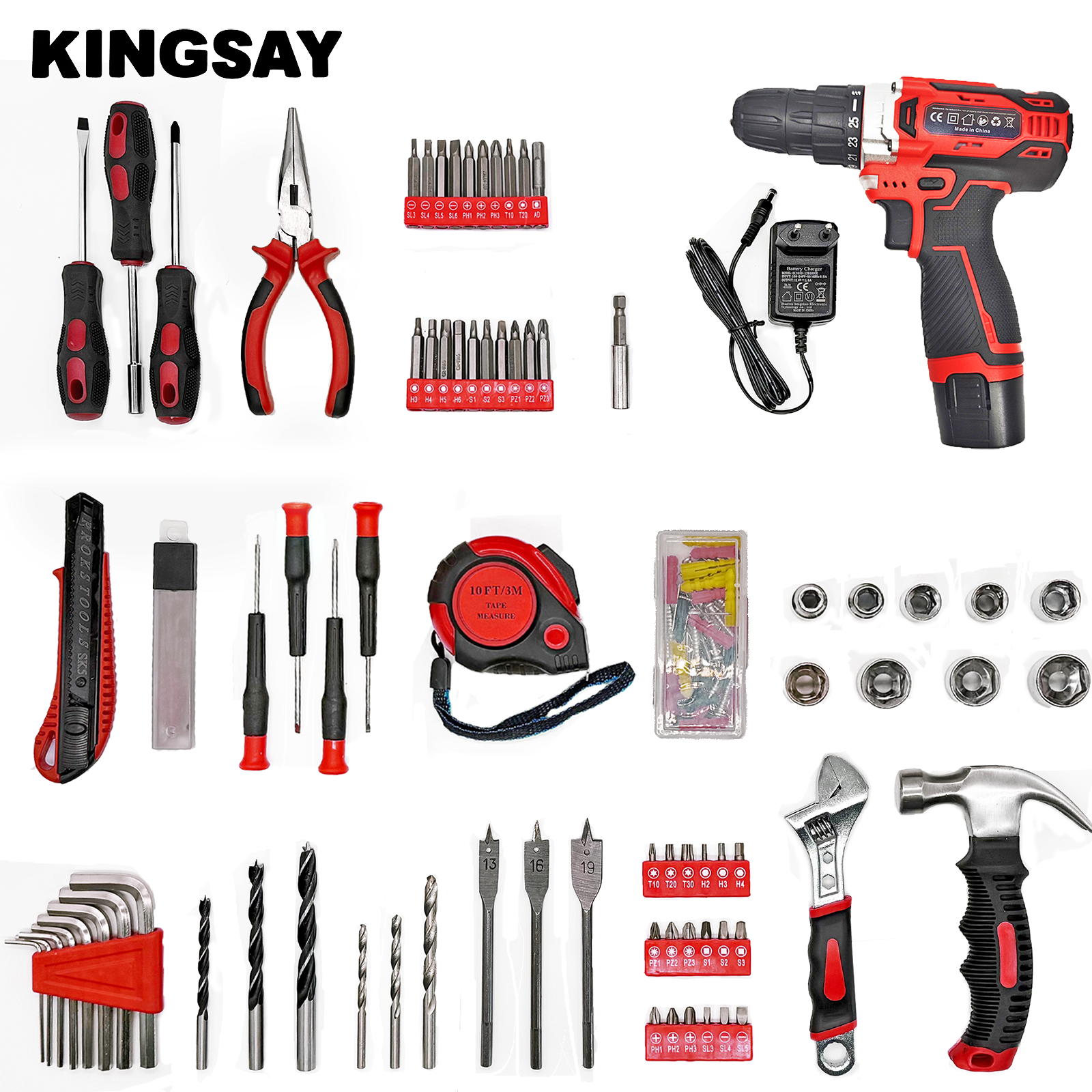 Die KINGSAY-handelsmerk 12V koordlose boor is die middelpunt van hierdie omvattende gereedskapstel. Dit word vergesel van alle noodsaaklike bykomstighede, insluitend draaiboor, hout plat boor, 1/4'' sok, magnetiese stukkies houer, verstelbare moersleutel en hegstukke, wat 'n volledige oplossing bied vir boor- en skroeftake.
